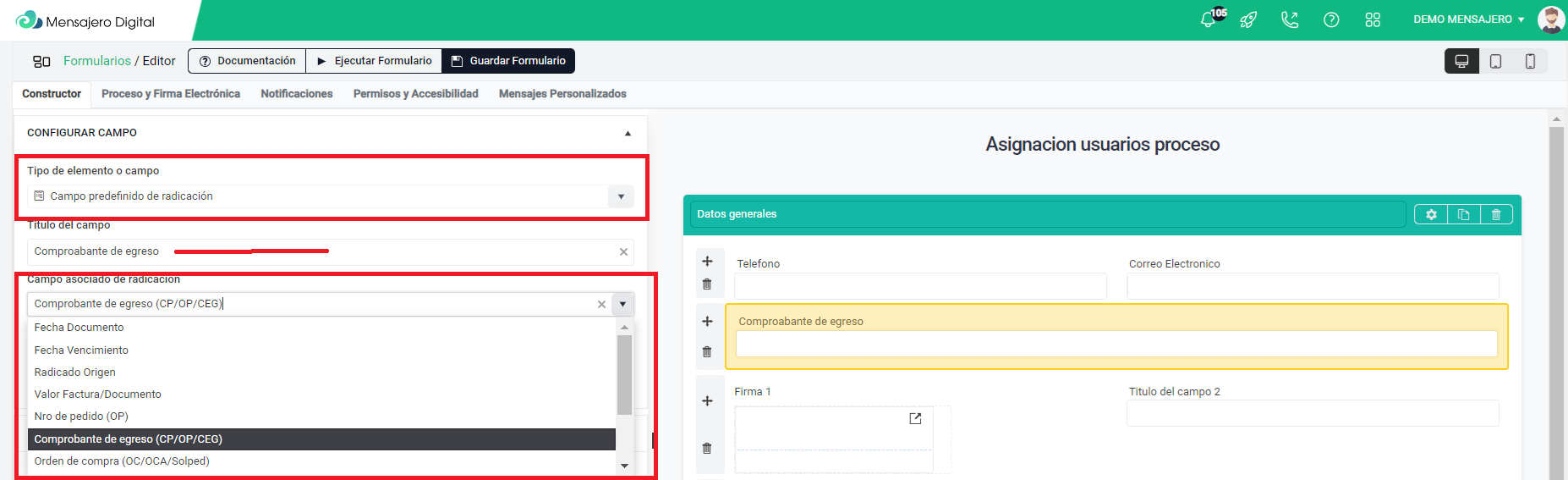 2. Le asignas el nombre al campo y luego **Seleccionas el campo asociado a radicación**. Y si observa, el nombre que sale del campo no es el campo de radicación seleccionado. sino el nombre que usted le asigno.