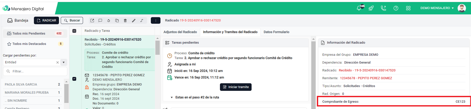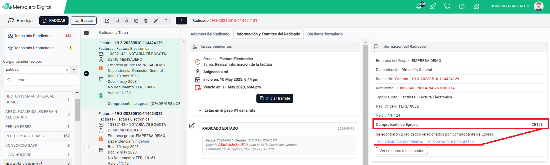 3. Cuando finalices el ingreso de datos en el campo indicado, veras en Mensajero Digital, un relacionamiento de la siguiente manera. Donde se le esta notificando que el radicado actual, el que esta observando, esta relacionado con otros dos radicados, lo que se evidencian en azul. Esto indicaría que tres radicados, estan relacionados con el comprobante de egreso CE123