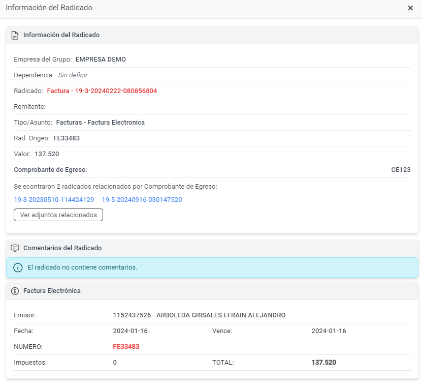 4. Si tienes en cuenta los siguientes pasos, verás una funcionalidad más adecuada aún. Si das clic en **Ver adjuntos relacionados** podrás ver en una sola pantalla los adjuntos de todos los radicados, ejemplo todas las facturas, contabilizaciones de cada una y el comprobante de egreso.