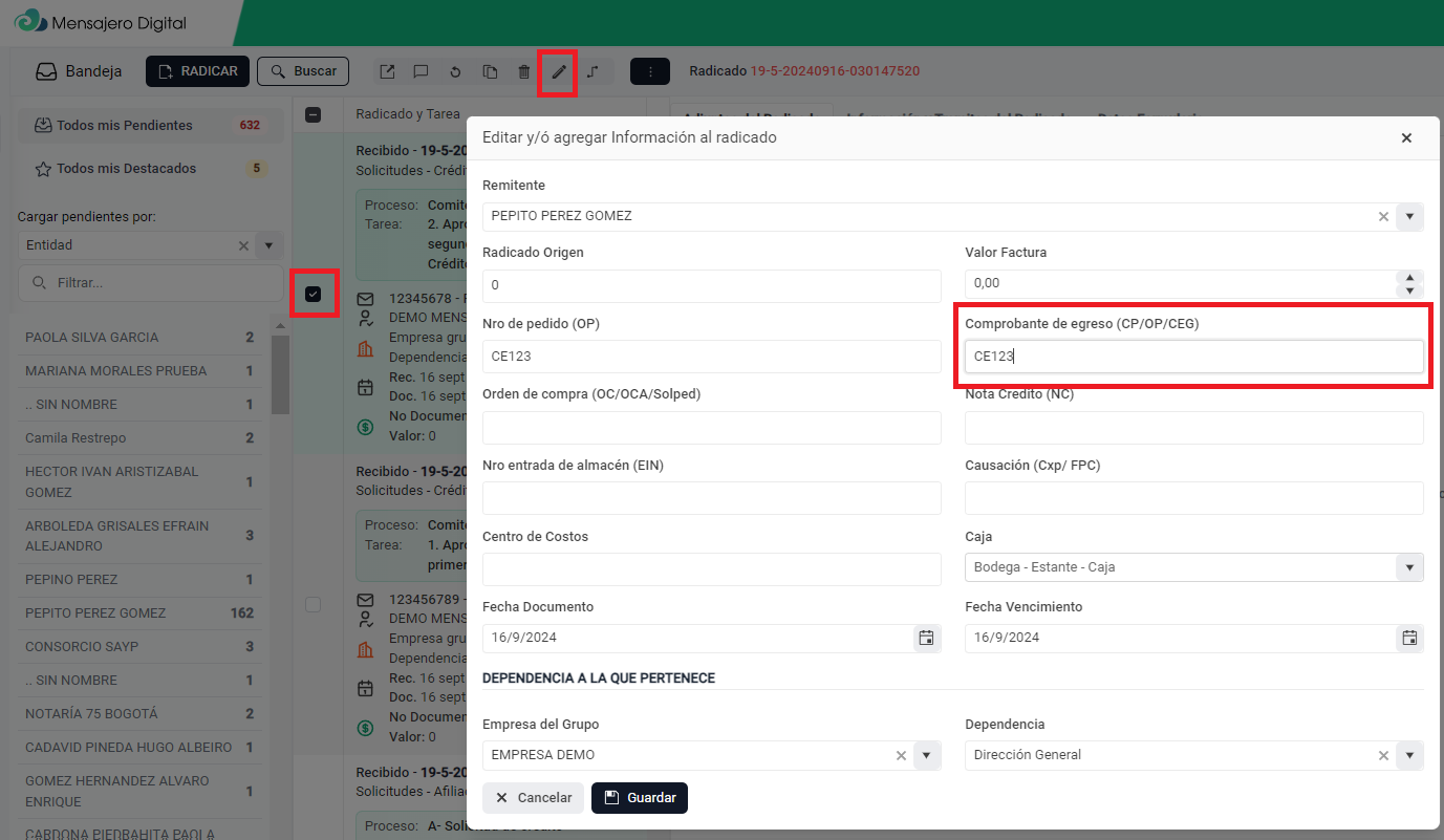1. Selecciona un radicado, luego le das clic en **Editar Radicado** y seleccionamos unos de los campos permitidos para esto, en nuestro caso será **Comprobante de egreso (CP/OP/CEG).** Ejemplo: Pondremos: CE123.