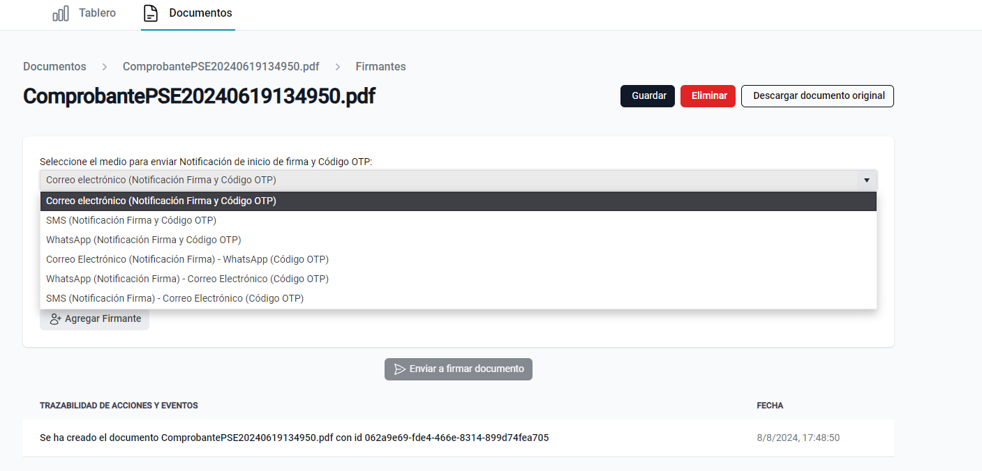 Una vez suba el archivo le saldrá una ventana en la cual debe seleccionar el medio de envio de notificación de firma y código OTP.
