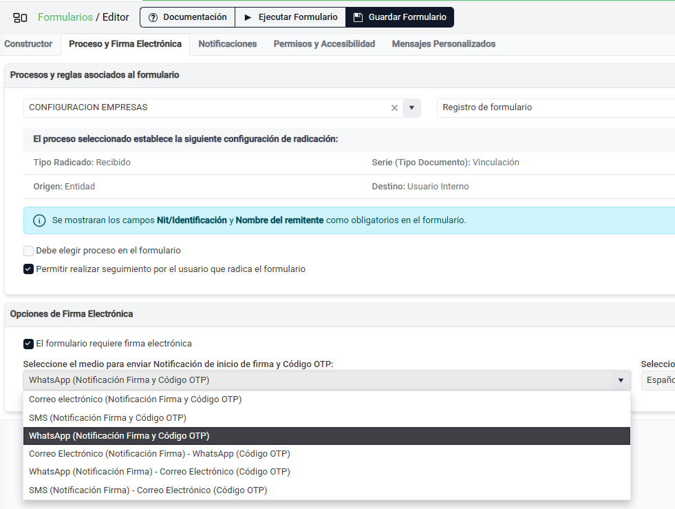 1. Edite el formulario, ingrese al constructor y luego a proceso y firmas electrónicas y seleccione la opción **El formulario requiere firma electrónica** y seleccione el medio por donde desea que la persona firme electrónicamente.