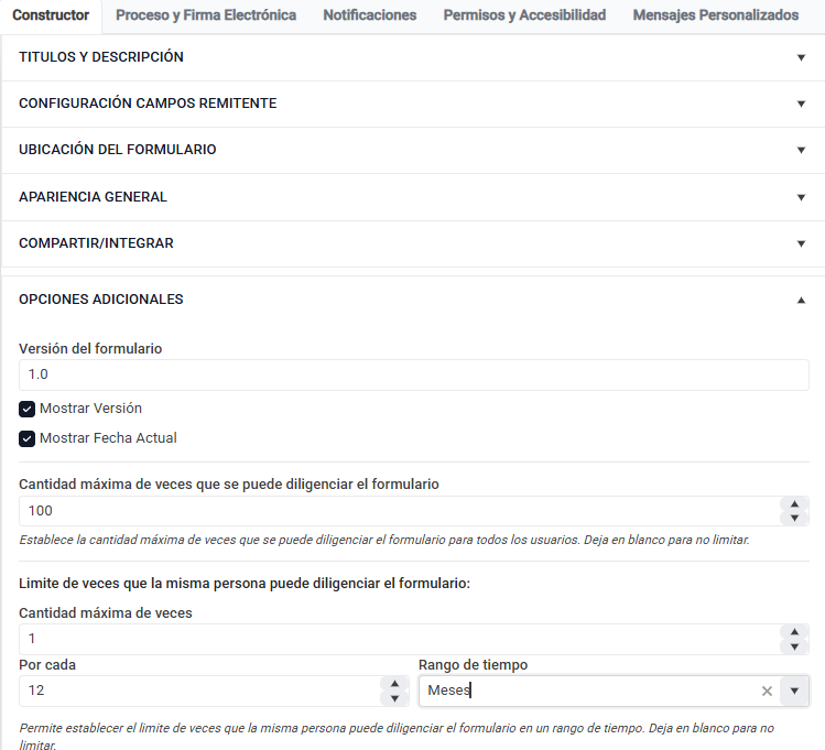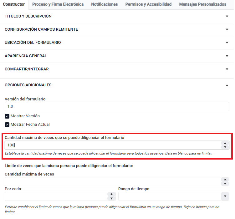 Si desea poner el **máximo de personas que completen este formulario**, debe ir al constructor a la opción **Opciones Adicionales** y completar lo siguiente: