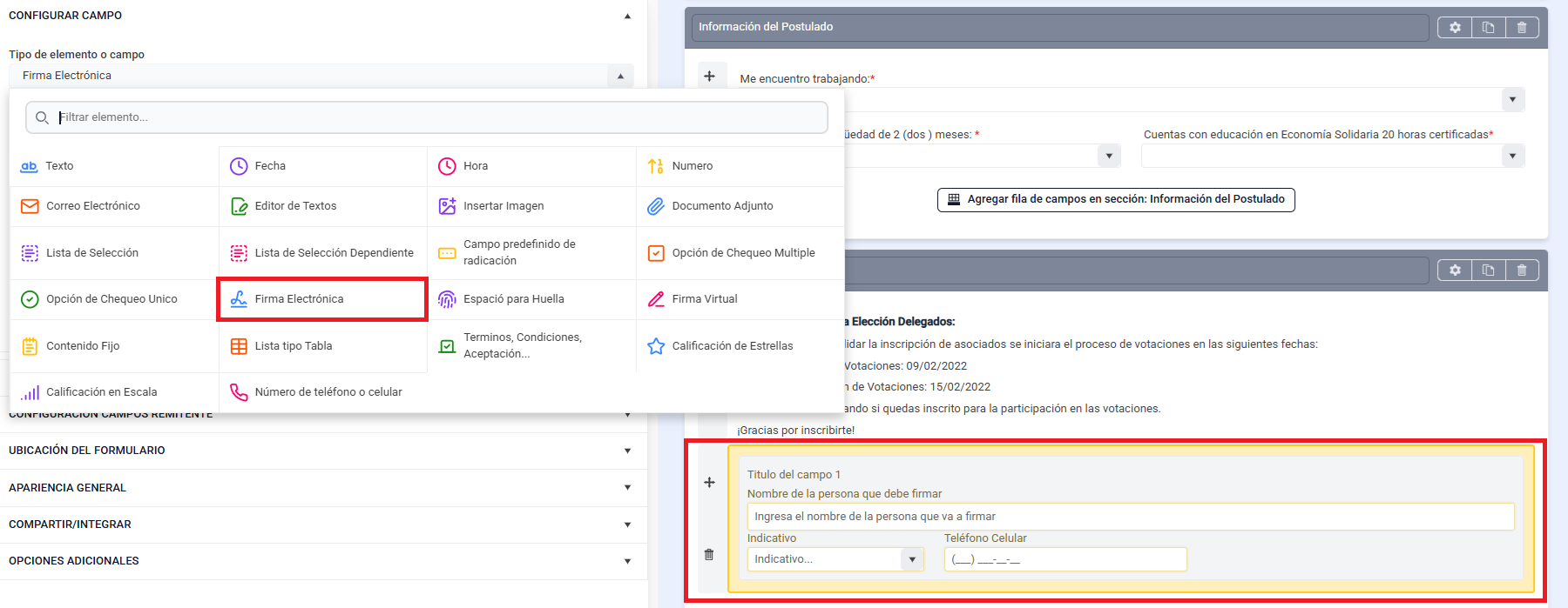 Luego regrese al editor y en una sección, cree una linea con una campo de tipo de elemento o campo **Firma Electrónica** y listo puede iniciar las inscripiciones.