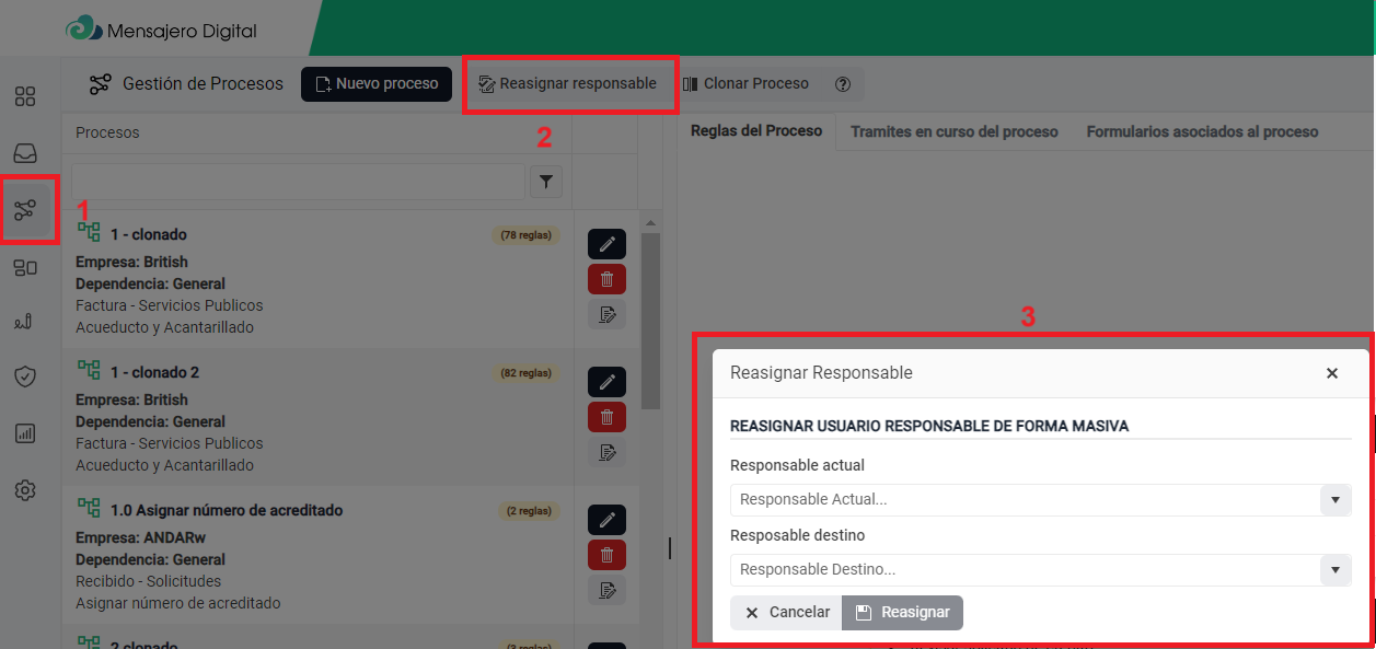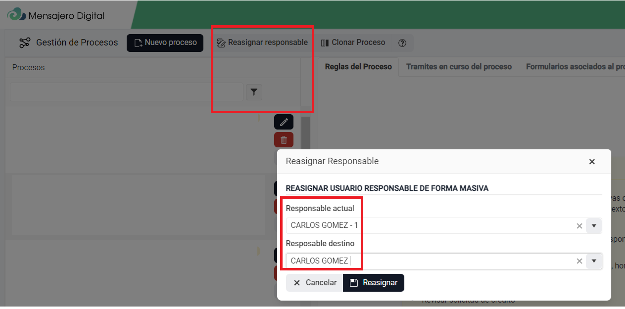 Mensajero Digital, buscará todos lo CARLOS GOMEZ -1 en todas las reglas de todos los proceso y cambiará al usuario responsable por el nuevo que es CARLOS GOMEZ.