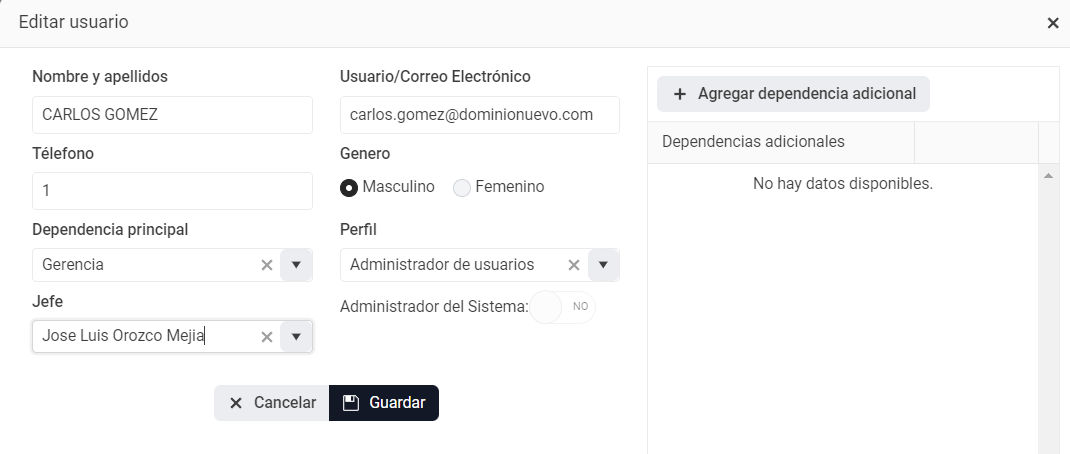 2. Crear el nuevo usuario. Ejemplo CARLOS GOMEZ correo: <carlos.gomez@dominionuevo.com>