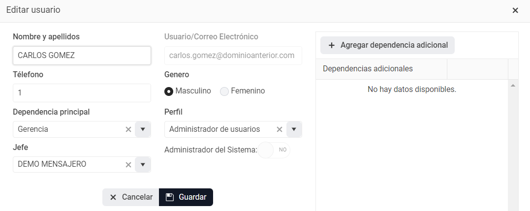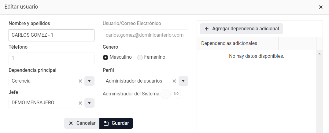 1. Se tiene un usuario el cual van a inactivar. Ejemplo: **CARLOS GOMEZ** correo: <carlos.gomez@dominioanterior.com>